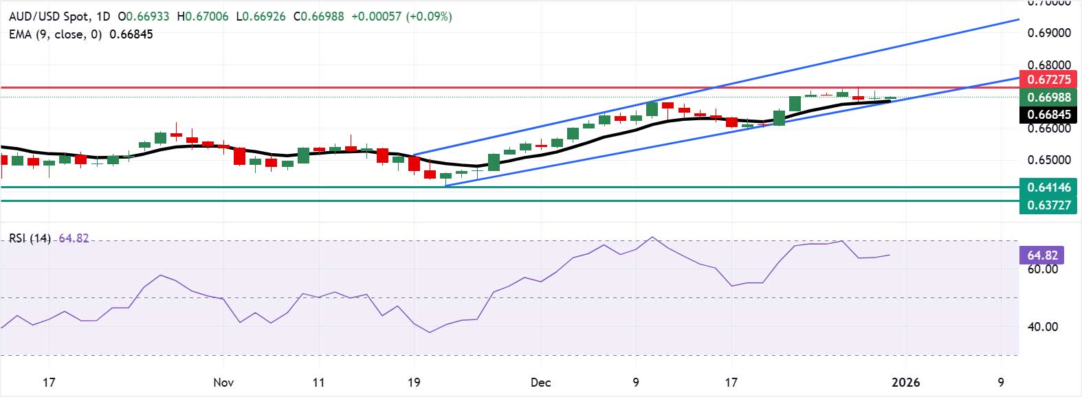 Technical analysis shows AUD/USD remains in an ascending channel, maintaining a bullish bias. The pair trades above the rising nine-day EMA, keeping the short-term uptrend intact. The 14-day RSI at 64.8 confirms bullish momentum, though not yet overbought.