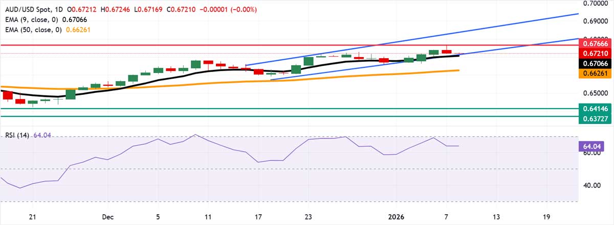 On the upside, a break above recent highs could open the door toward 0.6766, followed by the upper boundary of the ascending channel near 0.6840. Initial support is seen around 0.6720, aligned with the lower channel boundary, with additional support at the nine-day Exponential Moving Average near 0.6706. A sustained move below this zone could expose deeper support near the 50-day EMA around 0.6626.
