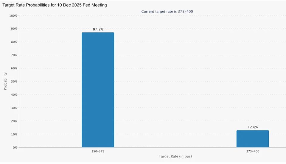 The Federal Reserve’s rate-setting committee reconvenes Tuesday, with markets waiting for Wednesday’s policy announcement and Powell’s Q&A – a key moment for hints on the central bank’s 2026 trajectory. Recent employment data revealed cracks in the labor market, with ADP and Challenger reports showing unexpected job losses and elevated layoffs. This has fueled near-unanimous market conviction that a 25-basis-point rate cut is coming, shifting the target range from 3.75%–4.00% down to 3.50%–3.75%.