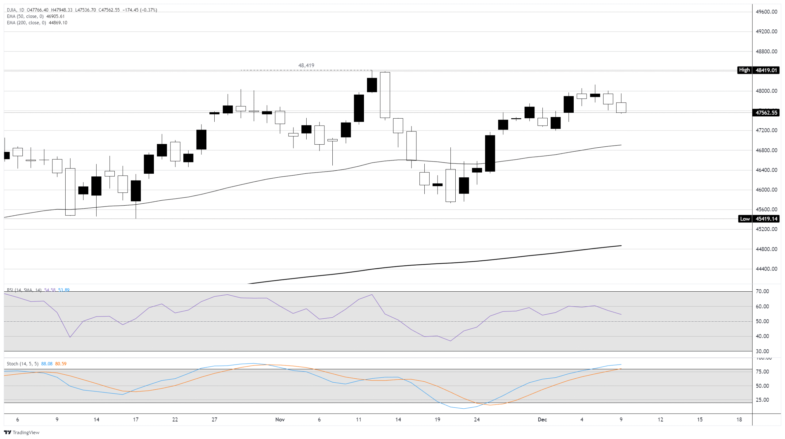 The Dow Jones Industrial Average (DJIA) extended its slide on Tuesday, dropping another 1,750 points in a second consecutive soft session as markets positioned ahead of the Federal Reserve’s (Fed) widely expected rate cut. Investors are awaiting the December 10 policy decision, where the Fed is forecast to deliver a third straight quarter-point reduction alongside updated projections in the Summary of Economic Projections (SEP).