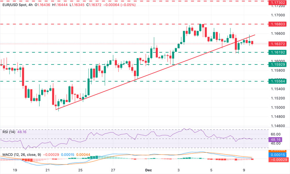 Failure to recover the trendline near 1.1650 may increase downside pressure toward Monday’s low at 1.1616, followed by December 1–2 lows around 1.1590, and the November 26–28 lows in the 1.1550–1.1555 area.