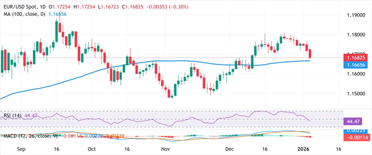 The EUR/USD pair comes under renewed selling pressure for a second consecutive session, sliding to a nearly four-week low around the 1.1670 area during Monday’s Asian trading hours. The pullback extends from the three-month peak posted just above 1.1800 on December 24, with bearish traders now waiting for a decisive break below the 100-day Simple Moving Average before positioning for deeper losses.