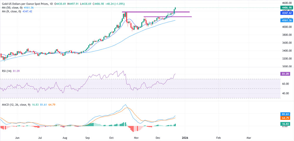 Year-end repositioning ahead of the long holiday period has also contributed to recent volatility, with some profit-taking emerging at stretched levels. Even so, the broader trend remains firmly constructive, with Gold on track for its strongest annual performance since 1979, up nearly 70% year to date.