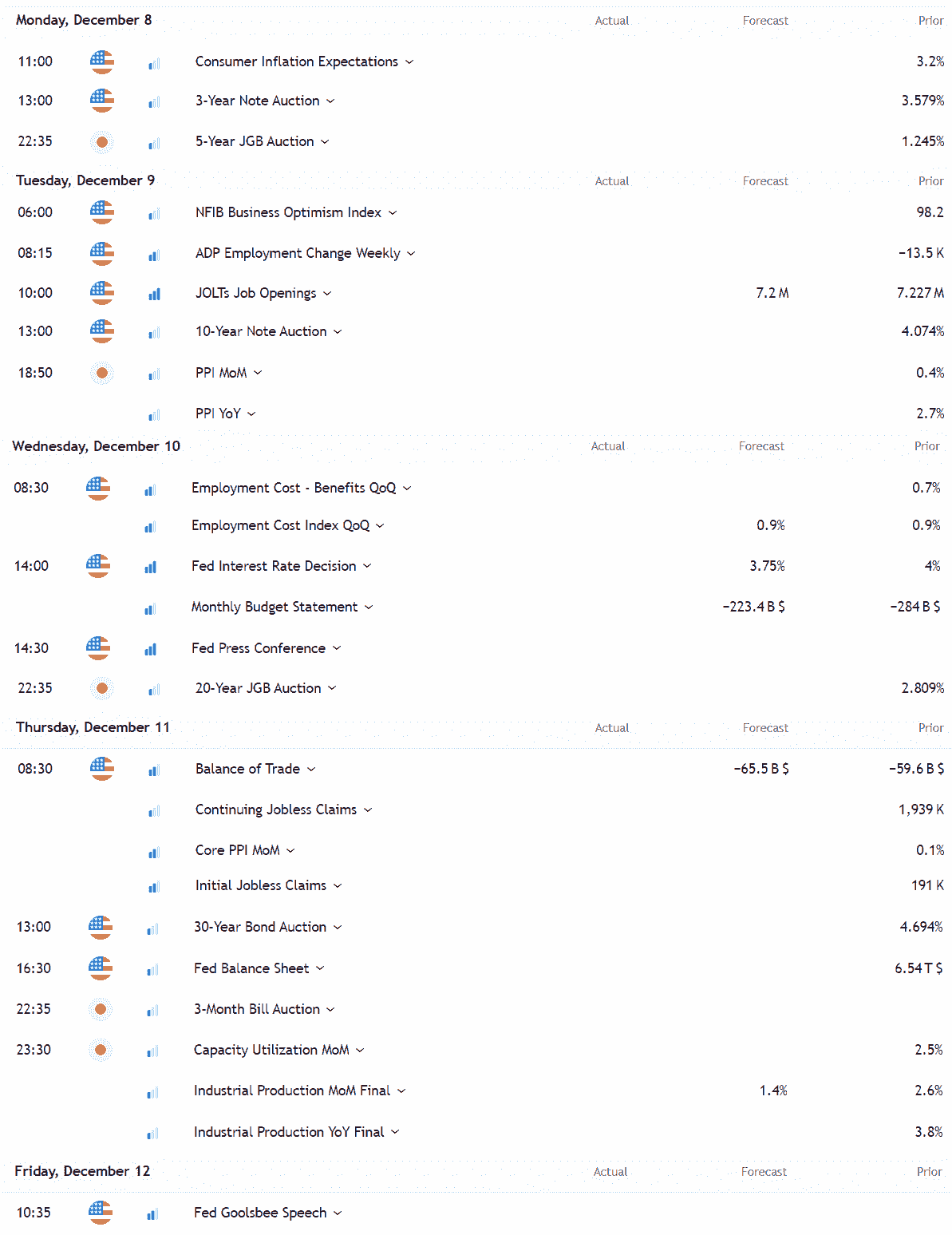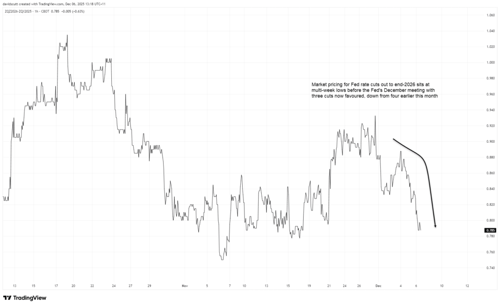 While the yen–JGB relationship remains intact, the correlation softened late last week as USD/JPY began tracking short-end U.S. rates more closely—rates heavily influenced by Fed expectations. On Friday, markets pared rate-cut bets for the end of next year to around 78.5bp from more than 90bp at the start of December. That shift coincided with a meaningful bounce in USD/JPY, underscoring that Wednesday’s FOMC meeting is the week’s defining catalyst.