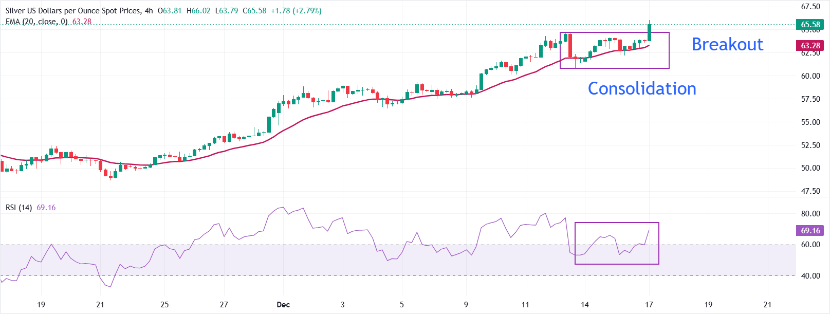 Silver is trading nearly 3% higher around $66.00 during Asian hours. The 20-period Exponential Moving Average (EMA) is rising steadily near $63.28, with price action holding comfortably above this level and keeping the short-term bias firmly positive.