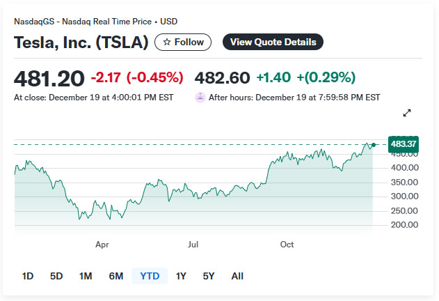 For Tesla shareholders, volatility is not the exception—it is the rule. The year 2025 proved to be another extreme chapter, marked by sharp swings, intense headlines, and a dramatic peak-to-trough trajectory. Still, despite the turbulence, Tesla shares reached a new all-time high this week, driven largely by renewed optimism around the company’s self-driving ambitions, and remain on track to outperform the S&P 500.