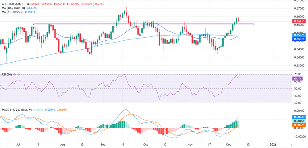 از منظر تکنیکال، جفتارز AUD/USD همچنان گرایش صعودی دارد؛ پس از آنکه بهطور قاطع سطح روانی 0.6600 را شکست و آن را به حمایت فوری تبدیل کرد. حفظ قیمت بالای این سطح، مومنتوم صعودی را حفظ کرده و مسیر را برای بازآزمایی اوج سال در 0.6707—سقف 17 سپتامبر و بالاترین سطح از اکتبر 2024 باز نگه میدارد.