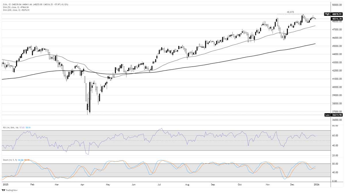 با وجود سه جلسه متوالی کاهش اندک، شاخصهای اصلی همچنان مسیر خود را برای ثبت سود سالانه قوی حفظ کردهاند. S&P 500 آماده است تا سال ۲۰۲۵ را با رشد حدود ۱۷٪ به پایان برساند و سومین سال متوالی بازده دو رقمی را ثبت کند. نزدک با رشد حدود ۲۱٪ عملکرد بهتری داشت که عمدتاً ناشی از هیجان مداوم پیرامون هوش مصنوعی بود، در حالی که داوجونز با وجود رشد ۱۳٪، به دلیل وزن کمتر در سهام فناوری، عقبتر ماند.