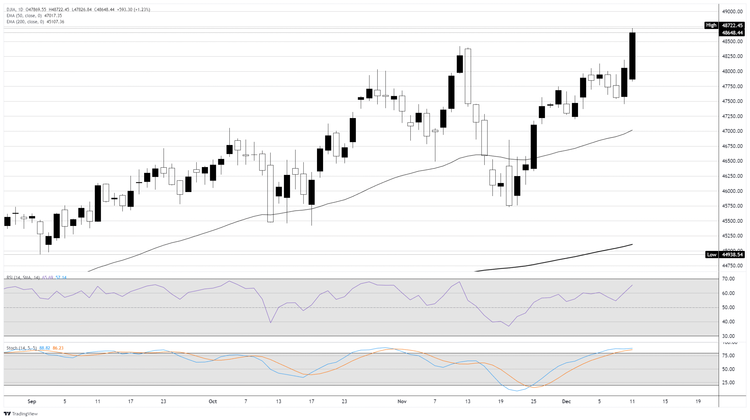 شاخص صنعتی Dow Jones روز پنجشنبه به رکوردی تازه رسید؛ در حالیکه سرمایهگذاران پس از کاهش نرخ بهره اخیر فدرالرزرو از سهام تکنولوژیِ تحت فشار خارج شده و بهسمت سهمهایی با پیوند مستقیمتر به رشد اقتصادی چرخش کردند. سهام Visa (V) پس از ارتقای تحلیلی یکی از عوامل تقویت داوجونز بود؛ در حالیکه S&P 500 تقریباً بدون تغییر ماند و Nasdaq با فشار فروش در سهام بزرگ تکنولوژی اندکی عقب نشست.
