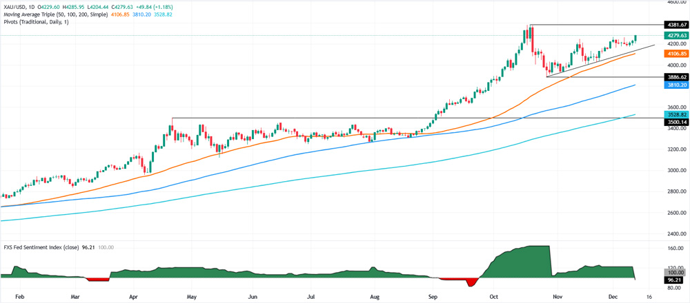 بستهشدن قیمت بالای ۴٬۳۰۰ دلار میتواند مسیر را بهسوی اهداف ۴٬۳۵۰ دلار و حتی رکورد تاریخی ۴٬۳۸۱ دلار باز کند. حمایت اولیه در ۴٬۲۵۰ دلار قرار دارد؛ سپس ۴٬۲۰۰ دلار و میانگین متحرک ساده ۲۰روزه در حوالی ۴٬۱۵۸ دلار قرار دارد.