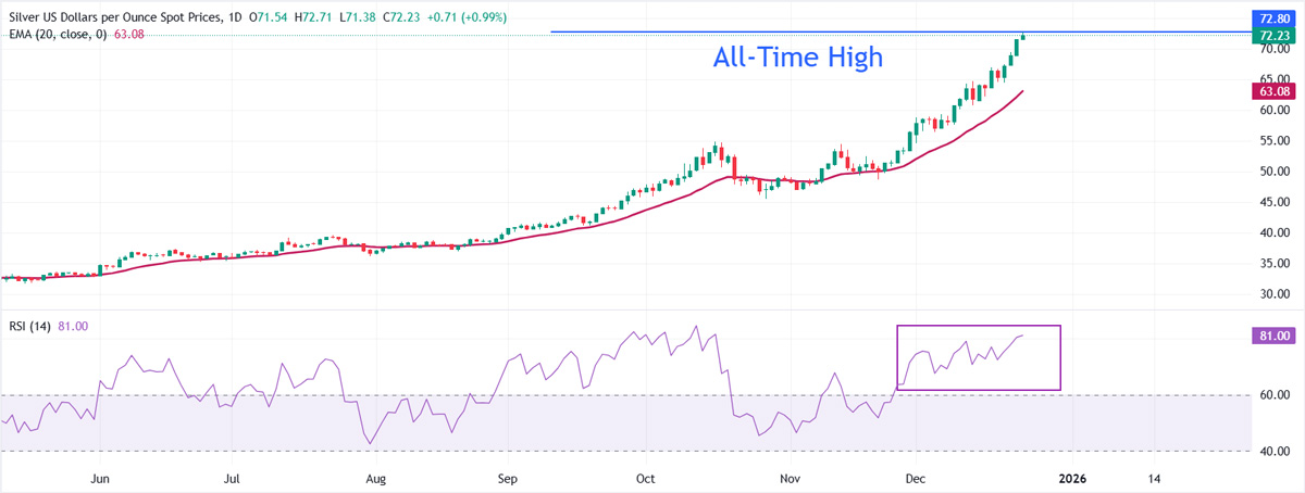 در نمودار روزانه، XAG/USD حوالی 72.19 دلار معامله می‌شود و سوگیری صعودی قوی خود را حفظ کرده است. قیمت بالای میانگین متحرک نمایی صعودی 20روزه (EMA) باقی مانده که همچنان حمایت دینامیک روند صعودی جاری را فراهم می‌کند.
